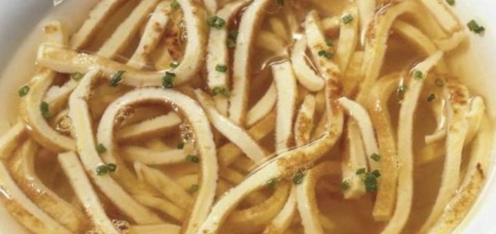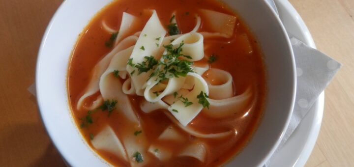 Zutaten: 2 Liter Hühnerbrühe1 Dose Tomaten 1 TL Tomatenmark 50 ml Sahne 12 %. 150 g Bandnudeln (nach Vorschrift gekocht) Salz, Pfeffer, eine Prise...