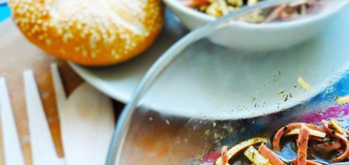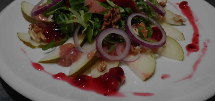 Zutaten: Vogerlsalat, Rucola 50 g Geräucherter Lachs1 Birne 1/2 Rote Zwiebel 1 TL Getrocknete Preiselbeeren1TL Walnüsse1 TL Zitronensaft Dressing: 1 EL Olivenöl1 TL Zitronensaft1/2...